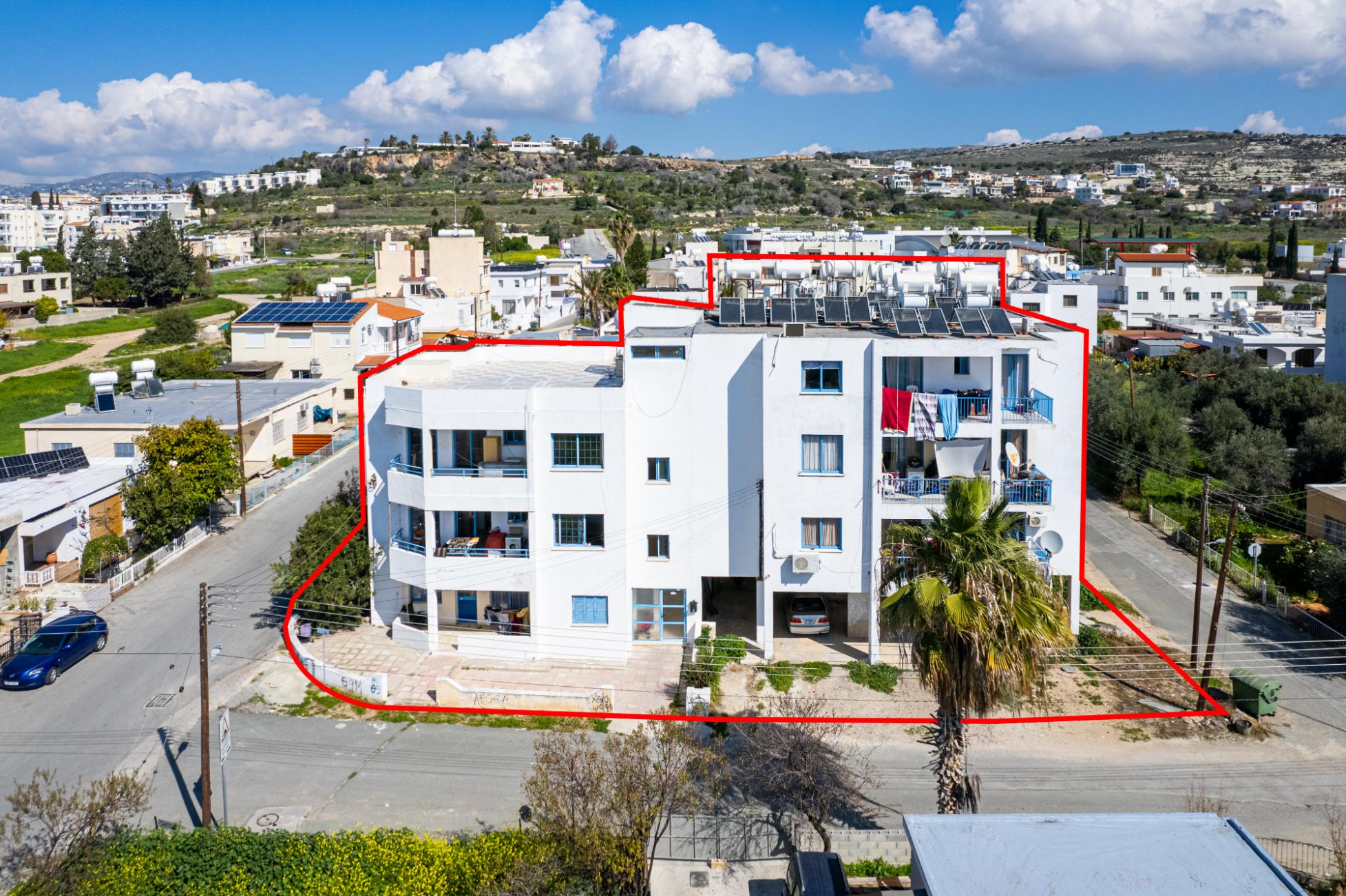 The property is a 50% undivided share of a three-storey residential building in Geroskipou. It is located 500m from the village center and 700m from Agios Theodoros secondary school. The building consists of 12 apartments built across two blocks, with 869sqm covered area plus 113sqm covered verandas. The property includes a 1-bedroom apartment, eight 2-bedroom apartments and three 3-bedroom apartments. The ground floor consists of a parking area (5 parking spaces) and two apartments. The building sits on a plot of 827sqm. It offers close proximity to all amenities and easy access to Paphos center.