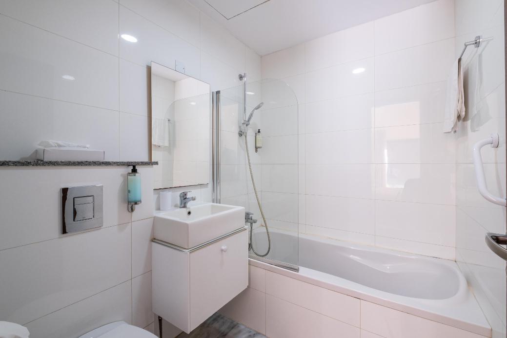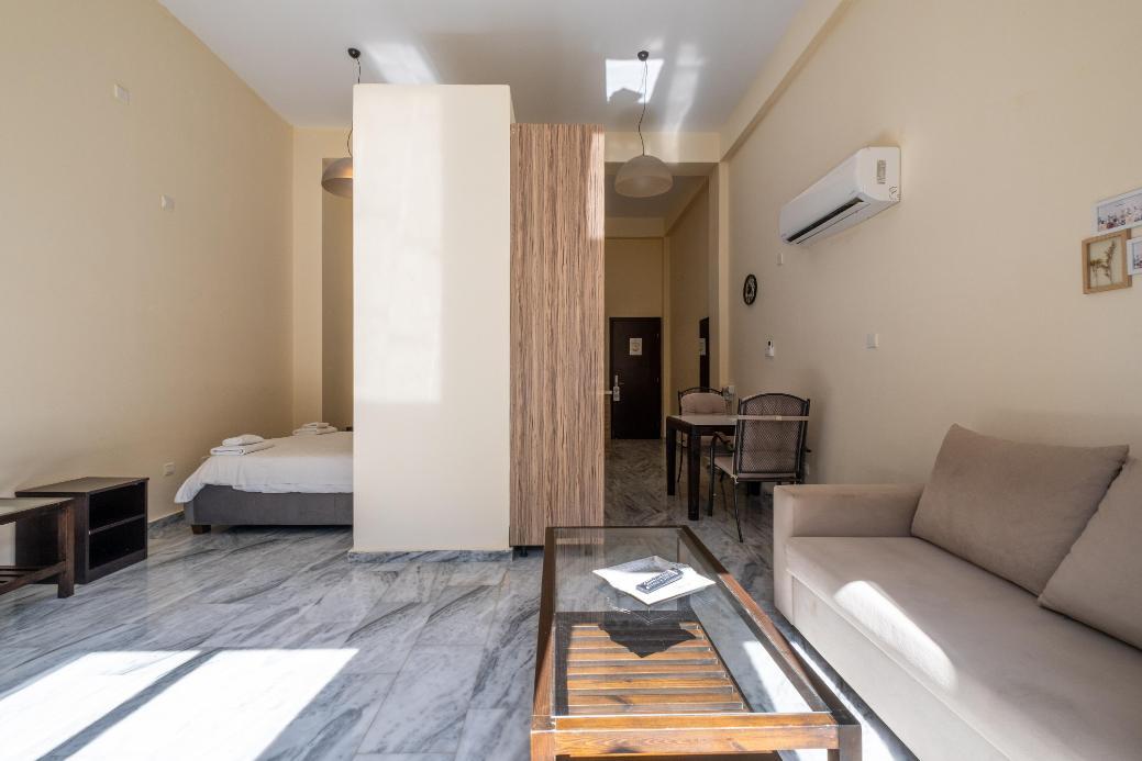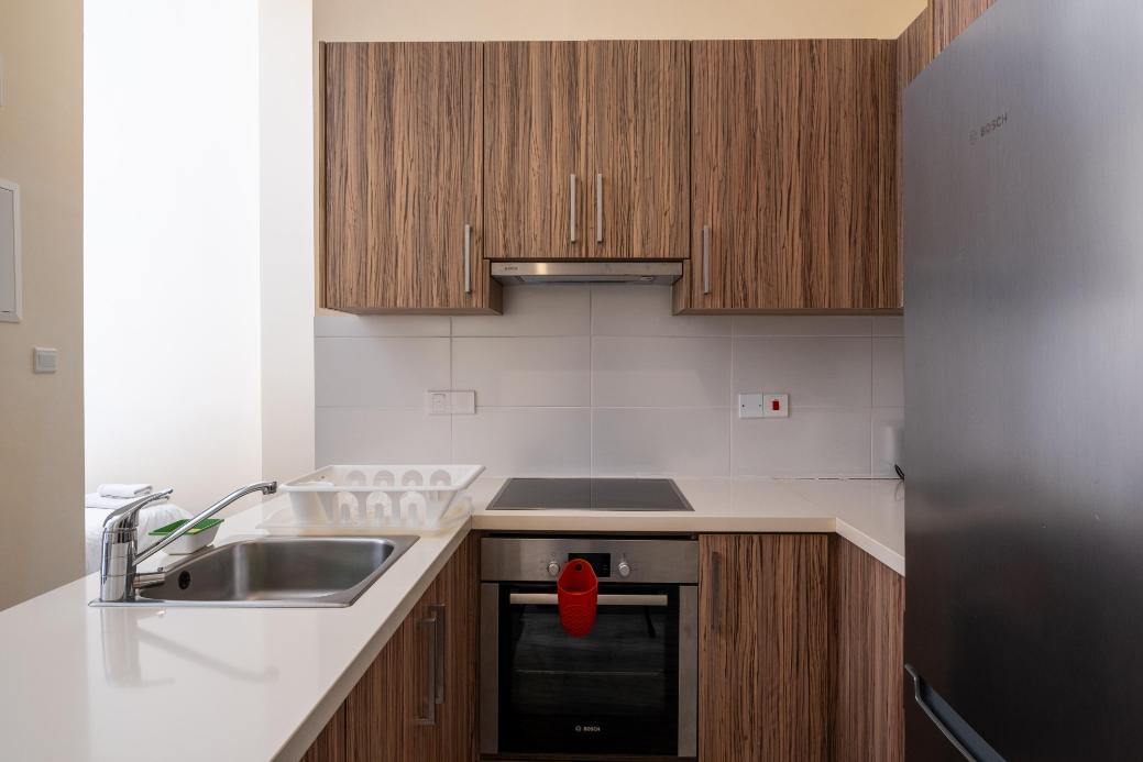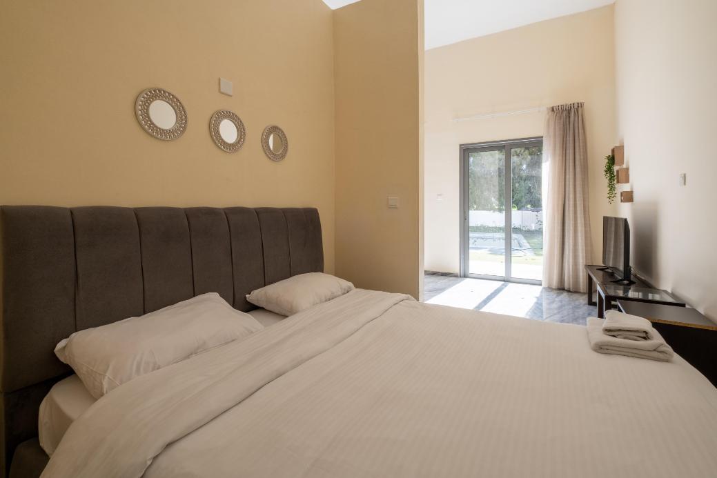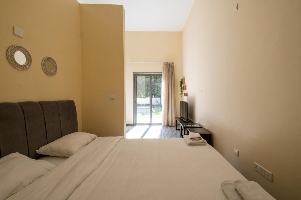 The studio has a covered area of 48sqm and uncovered verandas of 22sqm. It is situated on the ground floor of Block C. It consists of an open plan area with kitchenette, sitting area, a double bed, a bathroom with toilet and a private swimming pool.